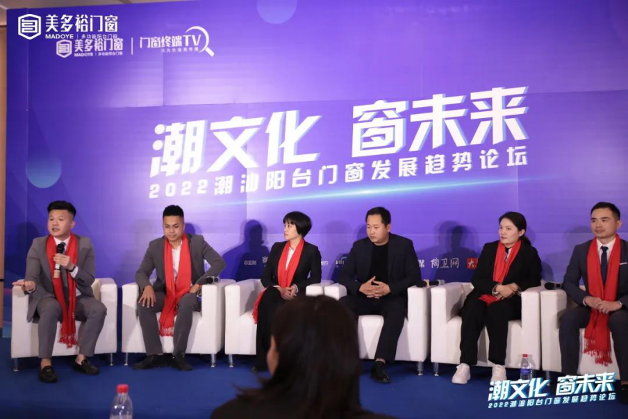 論壇對話嘉賓: 美多裕門窗董事長林龍智、潮州店林曉丹、佛山店馬曉娃、潮安店郭景廣、饒平店余冠宇在論壇上踴躍分享。