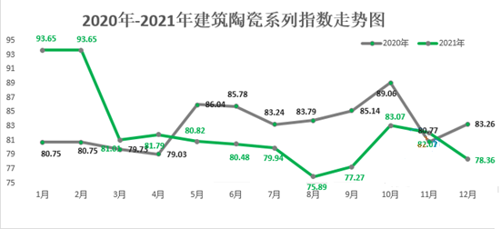 2021年建筑陶瓷系列指數與佛山陶瓷價格總指數走勢保持一致,全年指數在75.89點至93.65點之間大幅波動,2020年指數值在79.03點至89.06點間震蕩波動。從指數走勢規律可看出,2021年前半年指數走勢優于2020年,自5月份開始,指數走勢線逐步下行處于2020年走勢線之下。全年市場行情低迷下沉,各分類產品“以價換量”特征明顯,市場成交縮量陰跌。