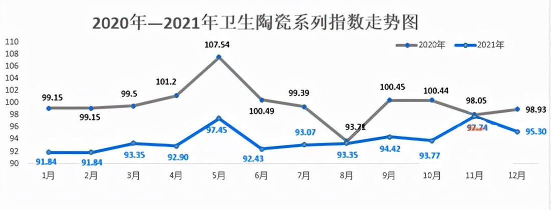 2021年全年衛生陶瓷系列指數呈平穩下行走勢,全年指數位于91.84點至97.74點之間波動,走勢圖波動曲線在2020年以下,市場行情低迷下行。潔具產品由于產品附加值較高,產品質量和品質較優,價位走勢較穩定。1-4月,指數持續維持在91.84點至93.35點間平緩運行,市場供需兩均,市場處于不溫不火之中;5月,隨著基建工程推進的加快,市場需求回升,指數走勢迅速回暖;6月后,受“雙碳雙限”、原材料漲價潮等影響,廠商經營壓力加大,指數走勢呈平穩下滑態勢;11月份,市場迎來小幅漲價潮,12月指數迅速回落至理性態勢。