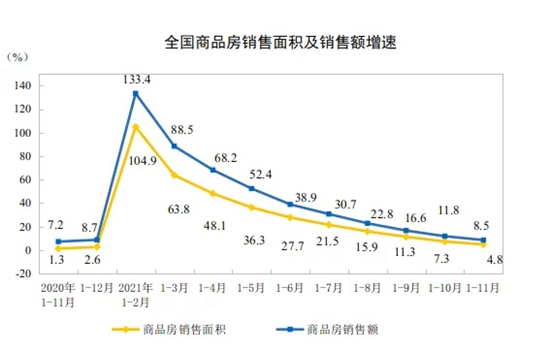 2021年全球經濟增長動力不足,疫情反復不斷,國內制造業市場需求增長動力仍待鞏固,制造業經營壓力增大。2021年中國制造業采購經理指數(PMI)在50%以上振幅波動,建筑業商務活動指數運行呈現出前高后低走勢,全年指數在54%至62%之間振幅波動,制造業增速發展趨勢放緩;再看2021年全國房地產開發投資增速及全國商品房銷售面積及銷售額增速走勢,增速持續收窄,樓市的不景氣直接導致建材需求下滑;2021年佛山陶瓷價格總指數持續下滑反映房地產市場的紅利減少,導致建材市場需求萎縮。