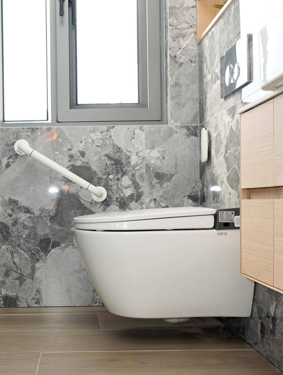 改造后,設計師調整衛生間布局,衛生間外新增一個洗漱區,衛生間內干濕分區,劃分出如廁區、淋浴區、洗漱區。經過設計師與鷹衛浴團隊的深入討論后,如廁區選用了鷹衛浴莫蘭迪系列掛墻智能坐便器BS81H,搭配SP5010E隱藏式水箱,增加一字扶手EC-1520,為安全如廁保駕護航。淋浴區選用135系列恒溫淋浴柱EB-13501001TH,手持花灑桿可升降,并增加無障礙設施,折疊座椅及扶手,大大提升了齊文英使用的安全性和舒適性,帶來多一份關懷與溫暖。